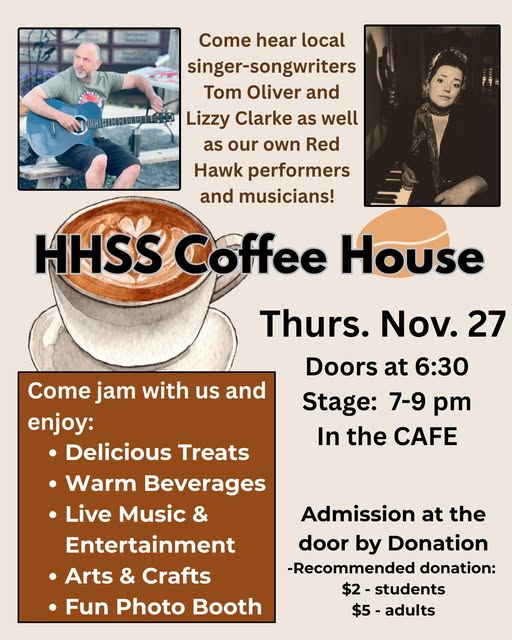 Doors open at 6:30; stage begins at 7:00 pm and we will transform the HHSS cafeteria into a cozy cafe.